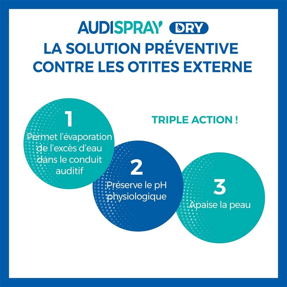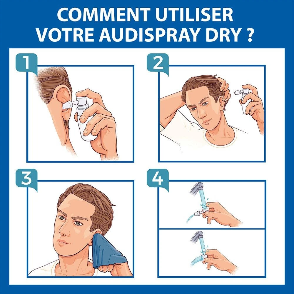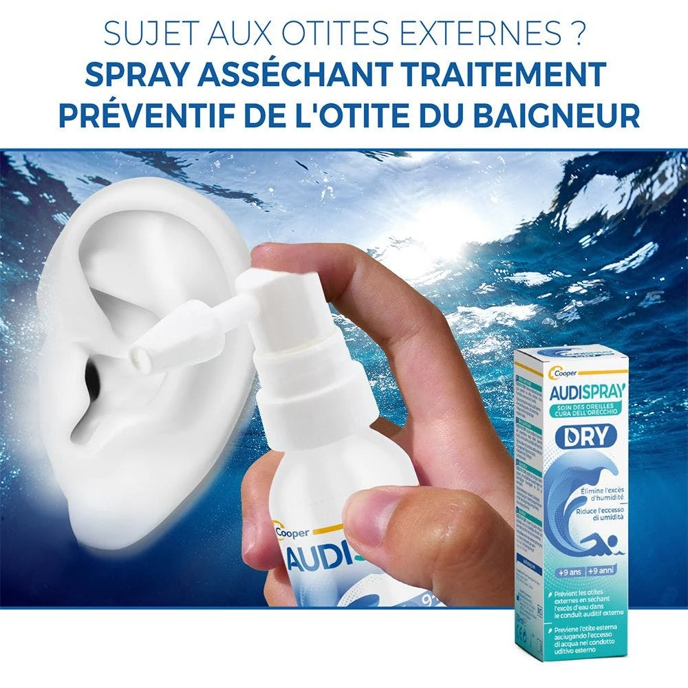 Audispray Dry allevia le orecchie intrise d’acqua dopo il bagno, la doccia o il nuoto.