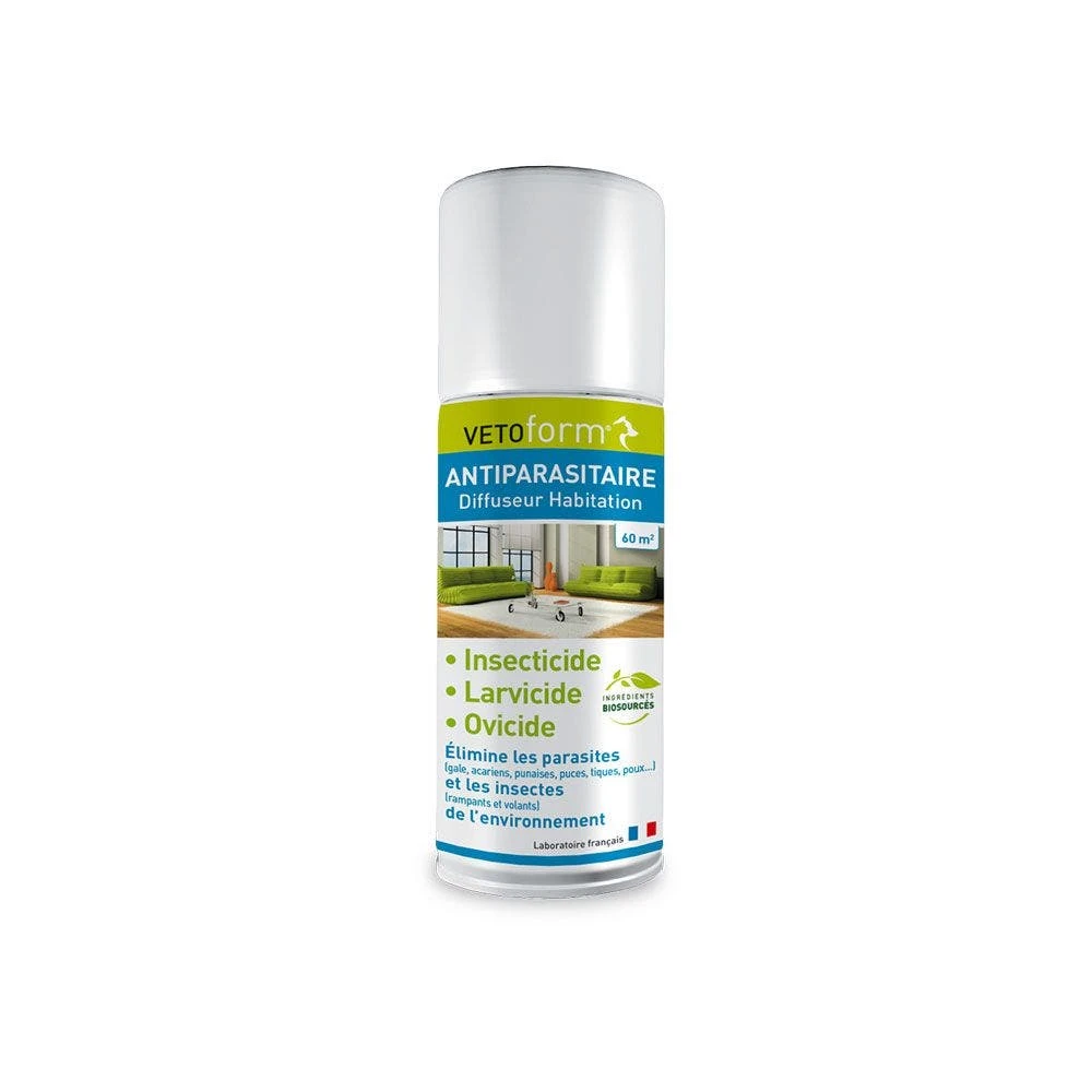 VETOFORM antiparassitario: spray domiciliare Elimina le pulci adulte, le loro larve e le uova nell’ambiente di Cane e Gatto. Uccide anche zecche, scabbia, acari, scarafaggi, ragni, formiche e tarme. Efficace fino a 4 mesi, per una superficie compresa tra 60 m2 e 100 m2. Questo spray domiciliare contiene estratti di Chrysanthemum Cinerariaefolium (fiori di piretro della Dalmazia), un insetticida a base vegetale. Raggiunge le aree difficili da raggiungere come tappeti, moquette, battiscopa e fessure dei pavimenti in legno, proteggendo l’intera casa per 4 mesi. Questo diffusore è disponibile in 2 formati: 150 ml per 60 m2 e 250 ml per 100 m2