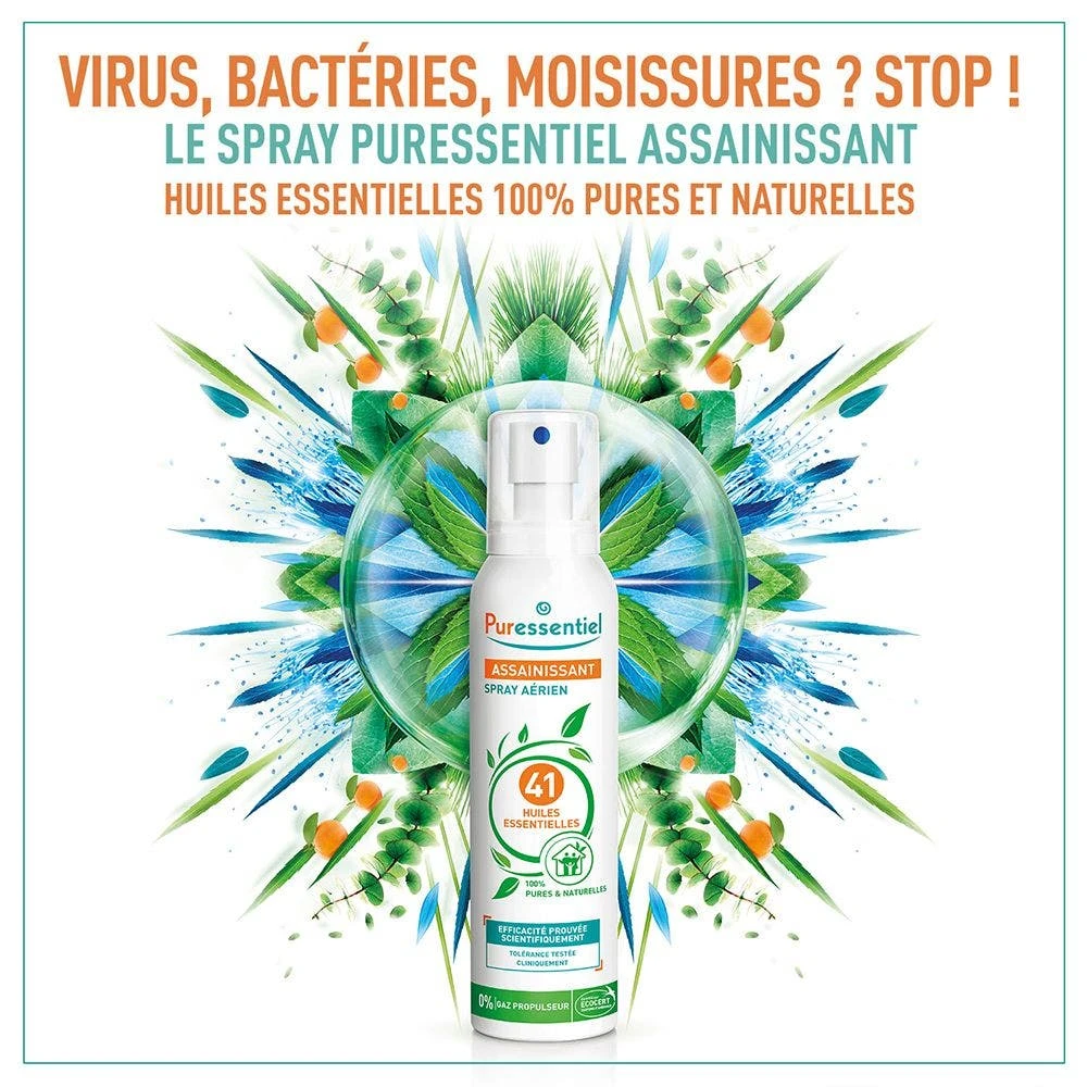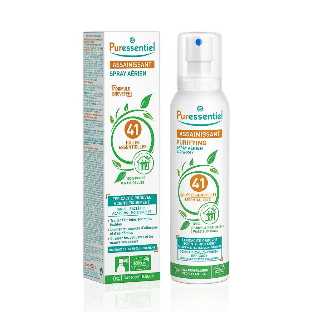 I laboratori Puressentiel hanno sviluppato questo spray purificante, contenente una formula brevettata con 41 oli essenziali, che distrugge i germi (batteri, virus, funghi microscopici) e i cattivi odori e ha anche un’azione antiacaro.