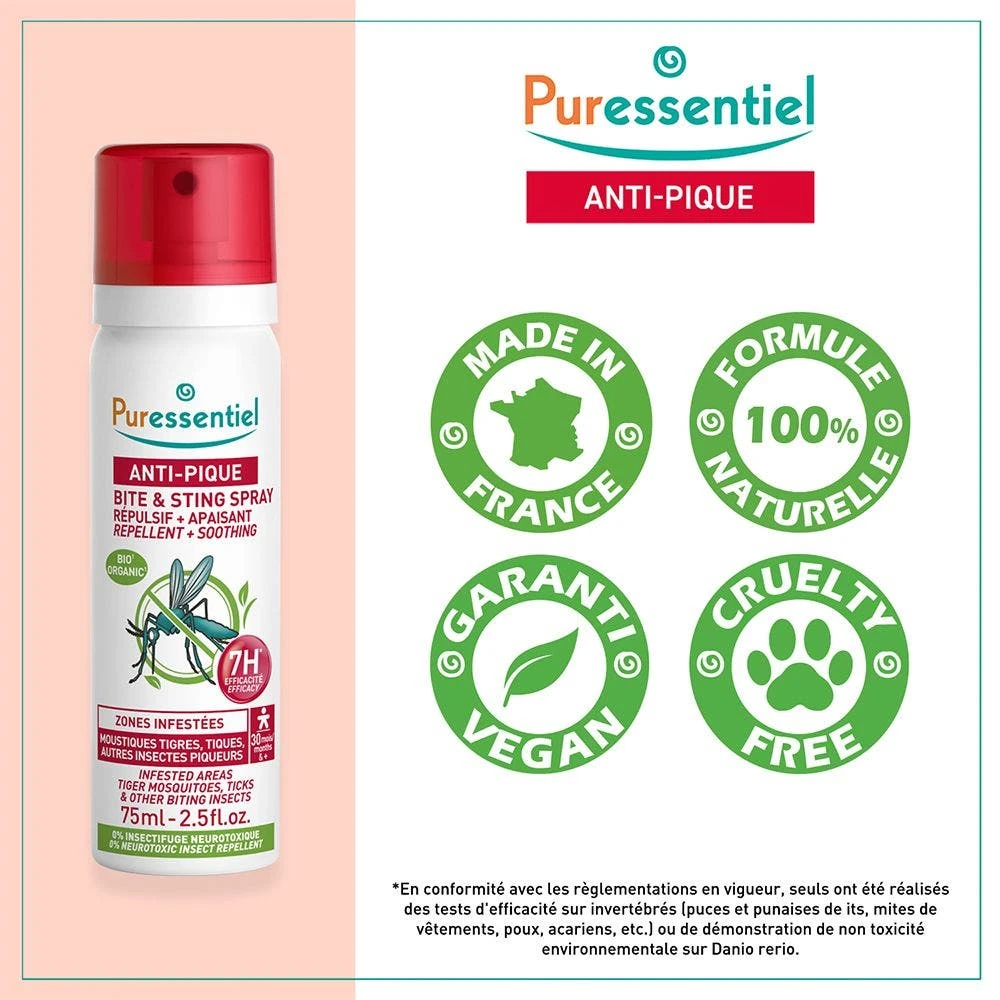 Grazie al suo cocktail di 5 oli essenziali, questo spray antizanzare è ideale anche per lenire le punture.