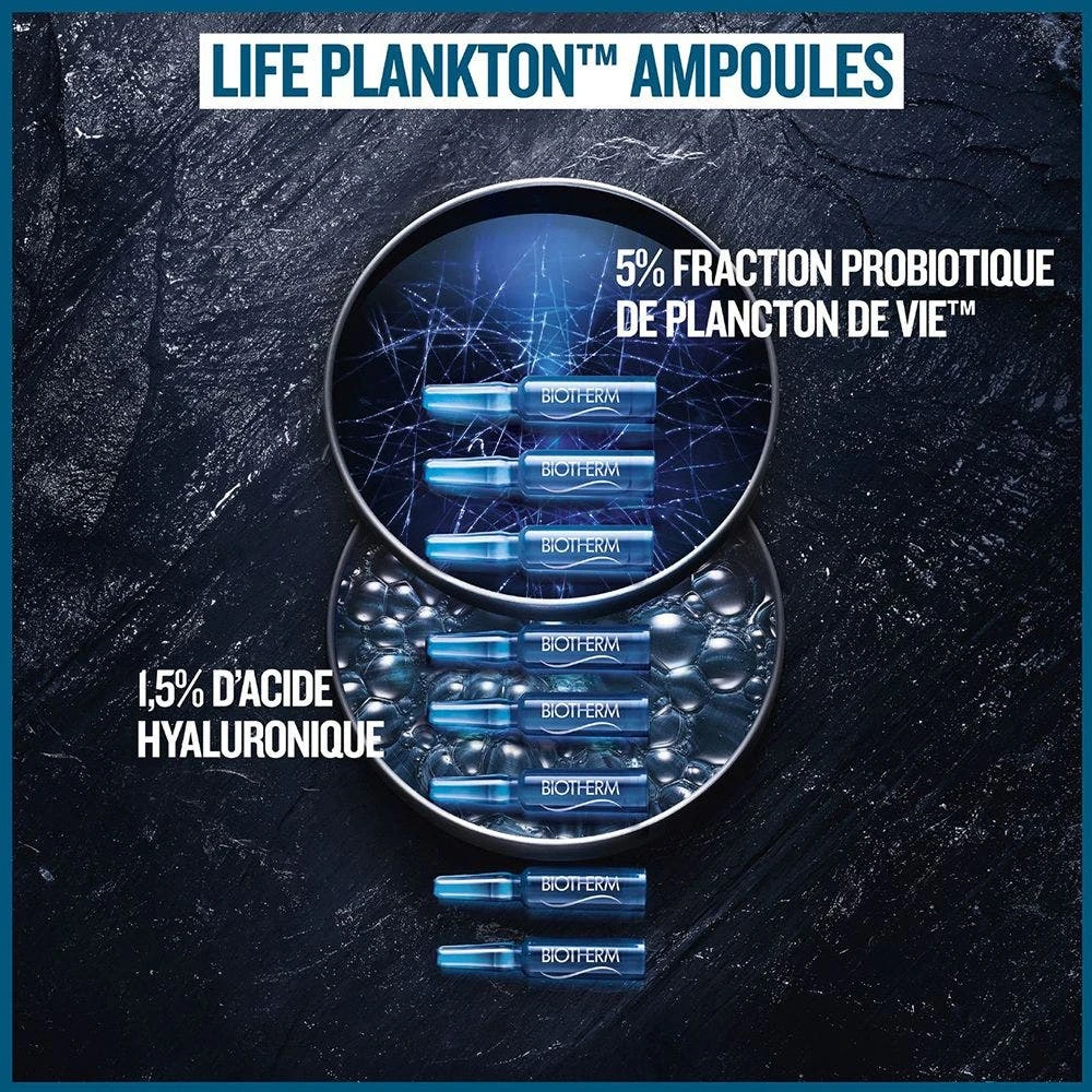 Ogni ampolla combina una formula altamente concentrata in Life Plankton™, frazioni probiotiche brevettate derivate dalla bioscienza, e Acido Ialuronico (1,5%) che penetra rapidamente nella pelle per un effetto immediato.